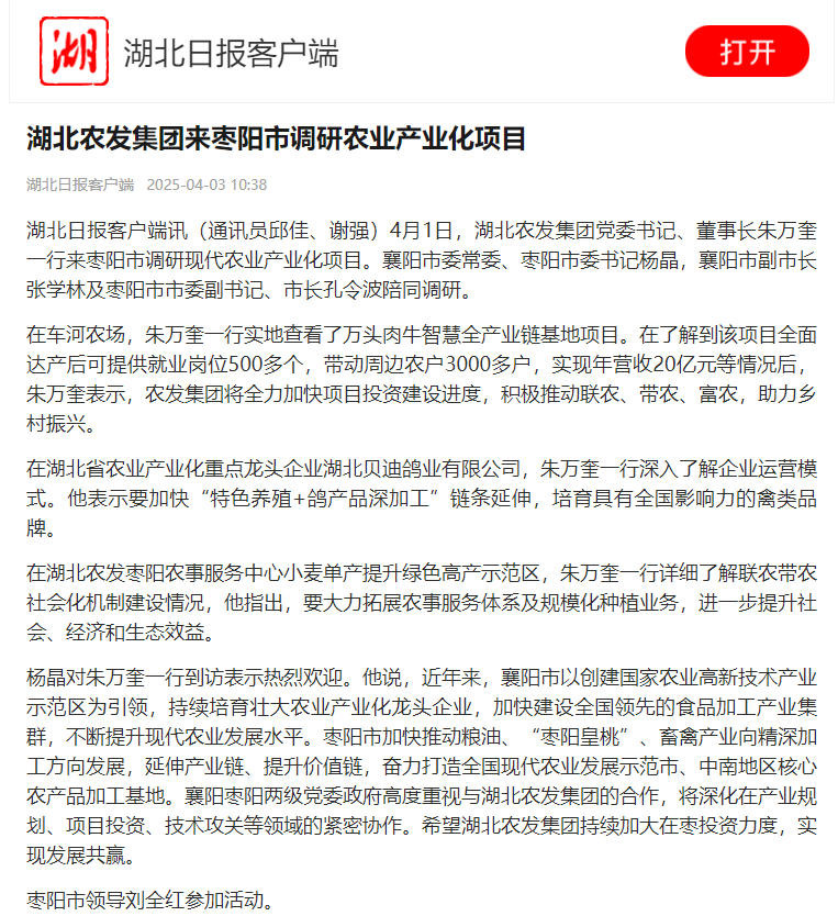 湖北日报:湖北农发集团来枣阳市调研农业产业化项目